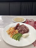 Eggs, refried beans, fried ripe plantain, cheese, cream, avocado & 2 corn tortillas / huevos, frijoles fritos, plátano maduro frito, queso, crema, aguacate y 2 tortillas de maíz